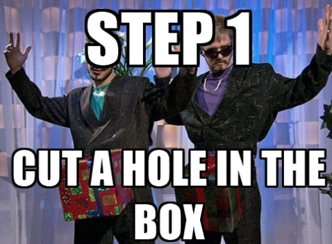 Teacher, “Step 1: Cut a hole in the box.” Students, ***snickers*** Teacher, “What?! Ohhhh…” Brandi W.
